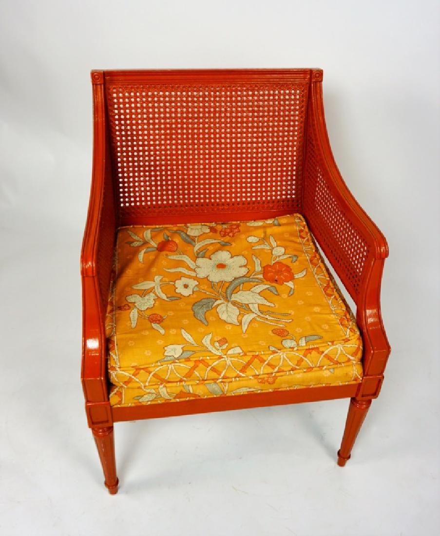 SoldPAIR FRENCH PROVINCIAL CANE BACK ARM CHAIRSCane back. Paint decorated. 34 1/2" h x 22 3/4" w x 22 3/4" d. Seat height 19".See Sold Price