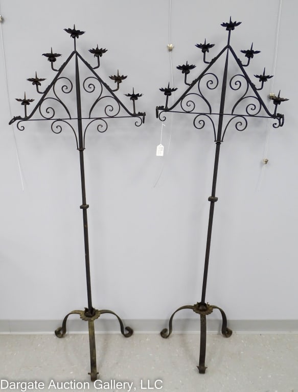 PAIR CAST IRON 5-LIGHT STANDING CANDELABRAS