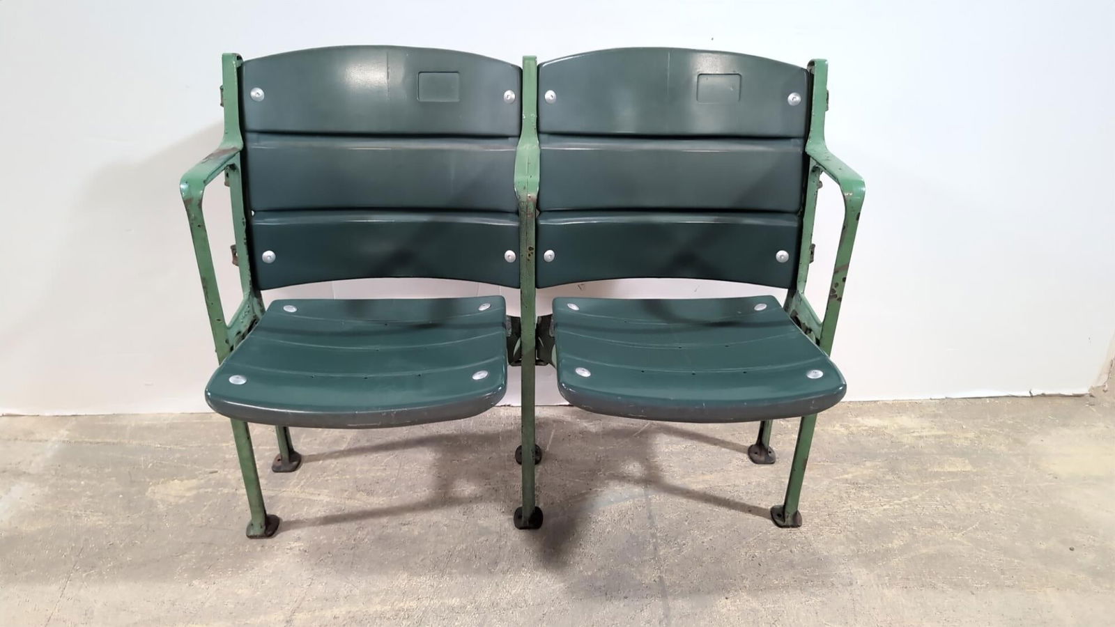 Pair cast iron base hard plastic stadium seats