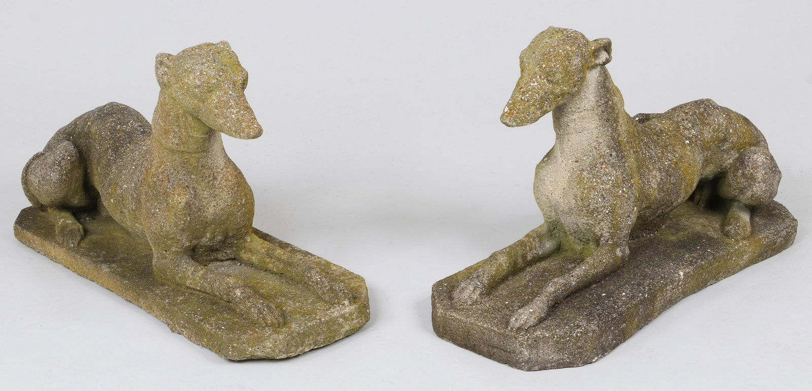 Pair cast stone recumbent whippets