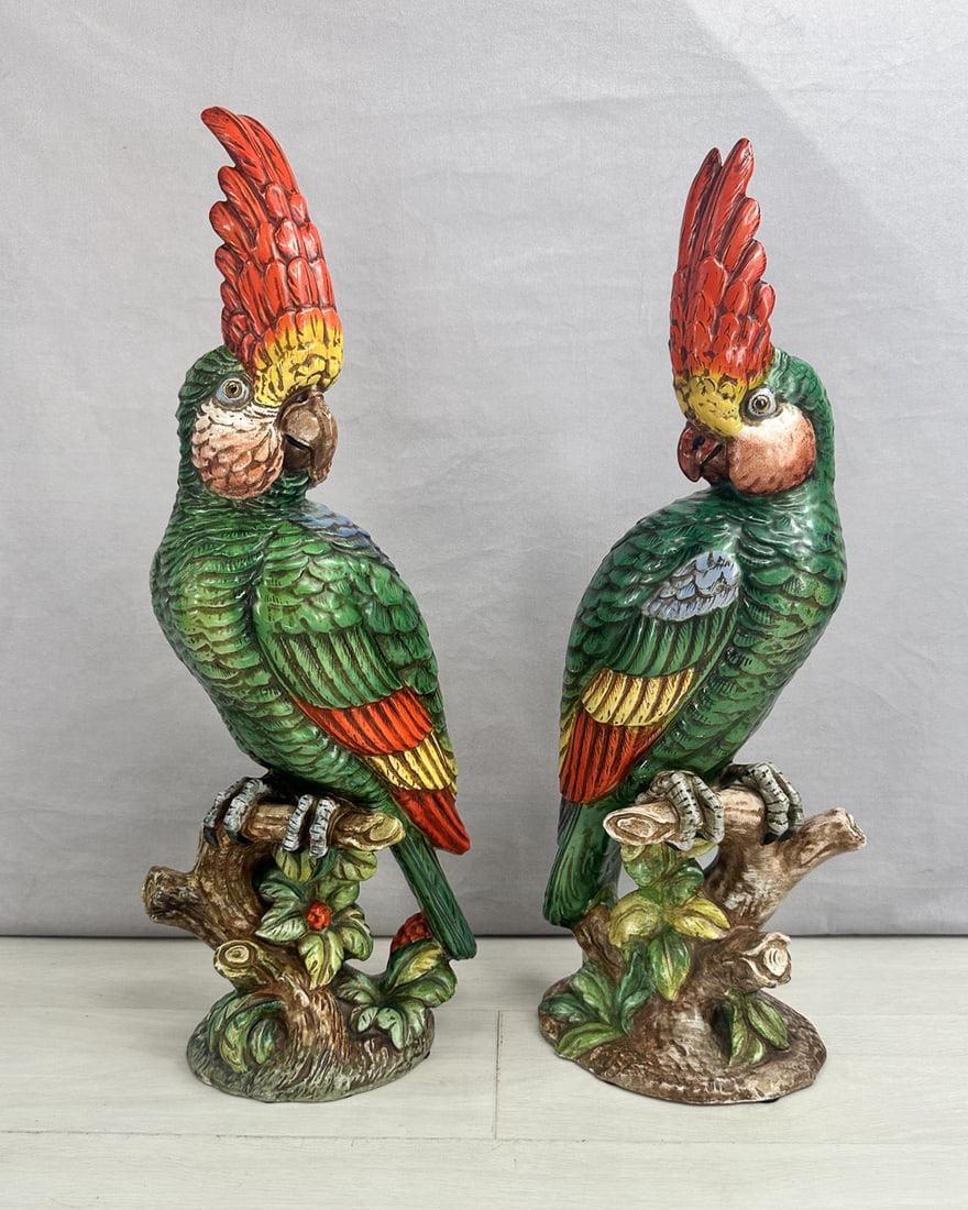 Pair Ceramic Parrots, Made In Italy