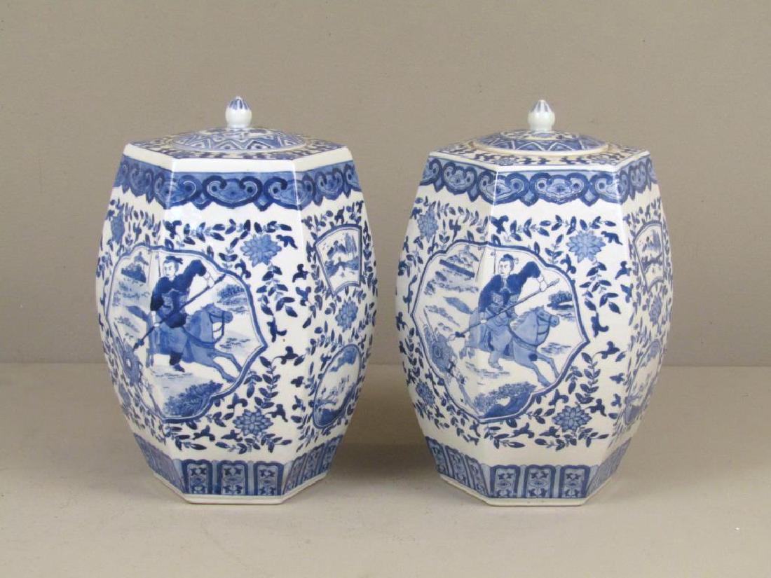 Pair Chinese Blue and White Hexagonal Covered Jars