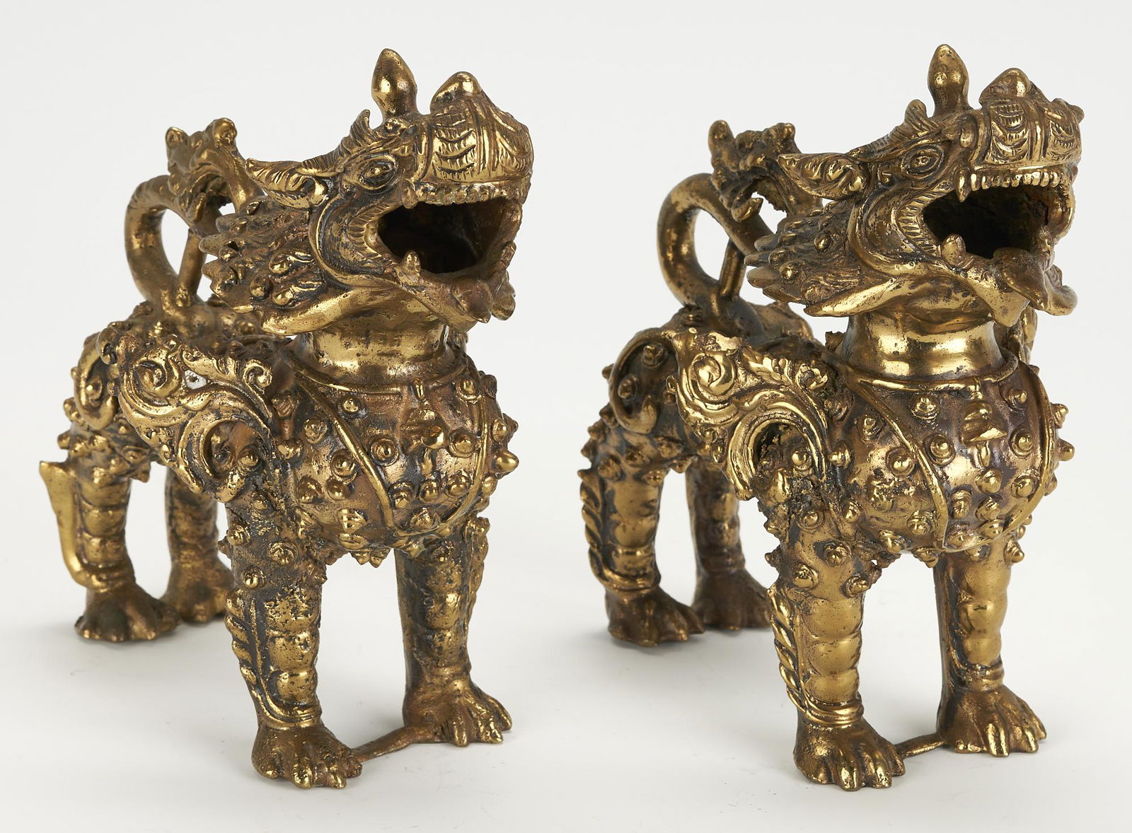 SoldPair of Chinese Bronze Foo Lions, 19th c., now in goldPair of Chinese Bronze Foo Lions, 19th c., now in gold paint, Taller- H.- 13 in., W.- 10 1/2 in., D.- 7 in.See Sold Price