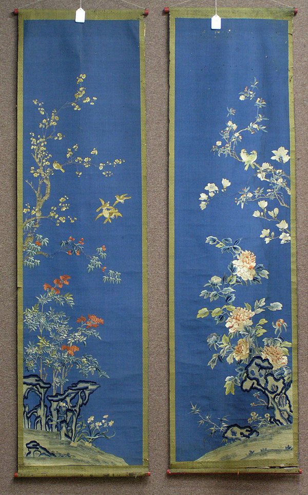 Sold2 Chinese Embroidered Silk ScrollsA pair of Chinese embroidered silk scrolls. The embroidery on silk depicts butterflies within a floral garden setting of flowers, leaves and vines. Mounted on thin embroidered fabric over paper. The pSee Sold Price
