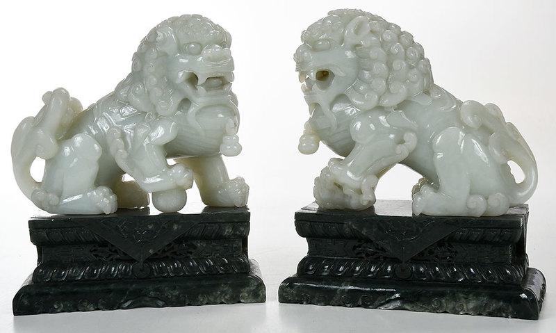 Pair Chinese Jade Foo Dogs, Spinach Jade Plinths