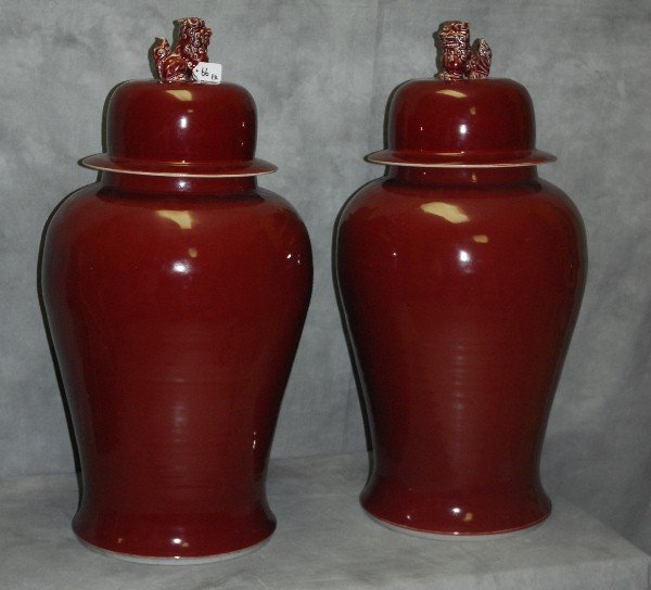 Pair Chinese red painted porcelain temple jars with foo