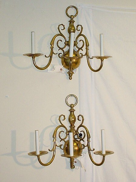 SoldContinental Brass Three-Light Wall SconcesNear Pair of Continental Brass Three-Light Wall Sconces , late 19th c. and later, made from bed warmer covers, h. 17 in., w. 13 in., d. 7 inNote: Not electrified. IMPORTANT: All purchases must be remoSee Sold Price