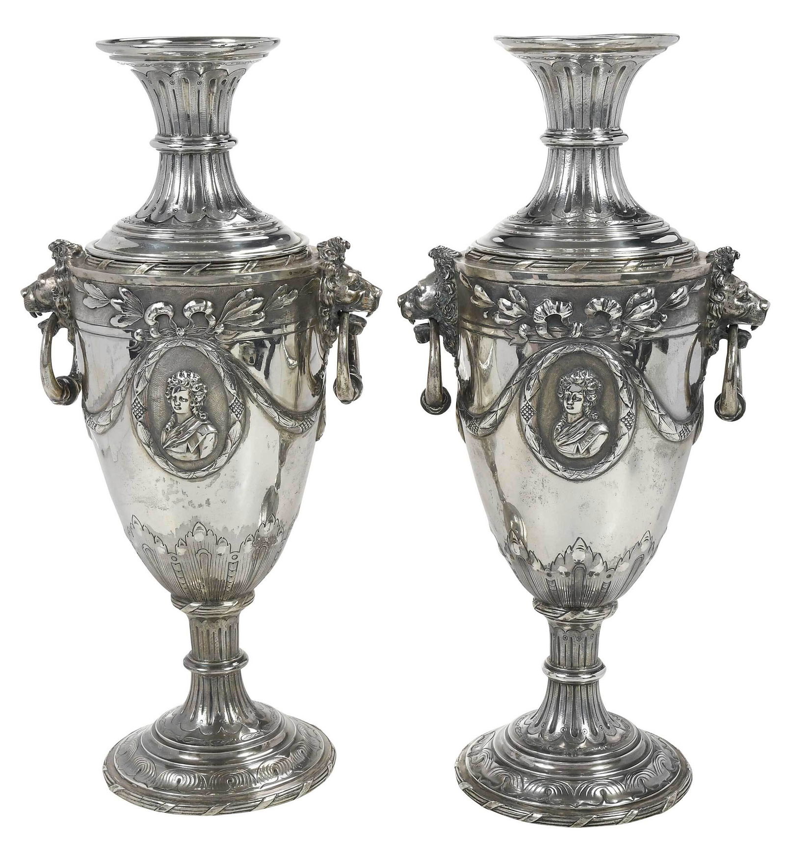 Pair of Pure Silver Vases with Gold Inlay by Shogo Sato4 days LeftPair of Gilt and Silver Inlaid Copper Vases4 days LeftPair of Persian Chased 875-Silver Two-Handle Pedestal Vases, Probably Isphahan, Mid-20th Century,Mar 27, 2026A PAIR OF MONUMENTAL FRENCH SEVRES STYLE ORMOLU-MOUNTED VASES6 days LeftTwo Persian Chased 875-Silver Individual Samovars, Probably Isphahan, Mid-20th Century, Height ofMar 27, 2026Pair of Neoclassical Rouge Marble & Gilt Bronze Covered Urns with Serpent HandlesMar 29, 2026A PAIR OF LARGE SILVER TORAH FINIALS. Hungary, early 20th century.Apr 21, 2026A Pair Of Large 19th century French Ormolu Mounted Obsidian Urns3 days LeftA Pair of Thai Silver Cylindrical Vases and Covers 19th centuryMar 25, 2026A Pair of American Gorham Martele 950- Silver Table Lamps4 days LeftPair of Cast-Iron Garden UrnsMar 28, 2026Pair of Bronze Garden UrnsMar 28, 2026Louis XV Style Ormolu Mounted Marble Candelabra, 23 days LeftPAIR OF LOUIS XVI STYLE BRONZE & MARBLE LAMPSMar 26, 2026Pair of George III English Silver Candlesticks, Nathaniel SmithMar 25, 2026Pair of French Bronze Patine Borghese Urn LampsMar 28, 2026