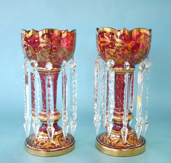 Pair Cranberry Lusters with Gold Decoration. 14.5