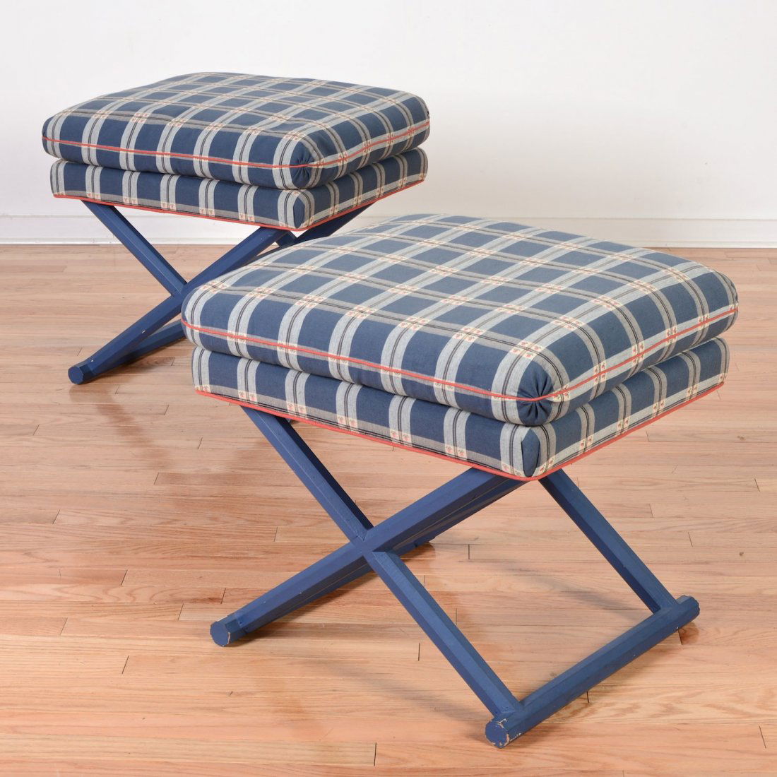 Pair decorator painted pillow top X-form stools