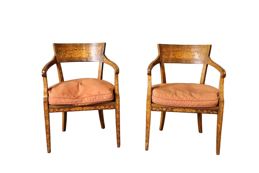 PAIR DUTAN MARQUETRY OPEN ARM CHAIRS