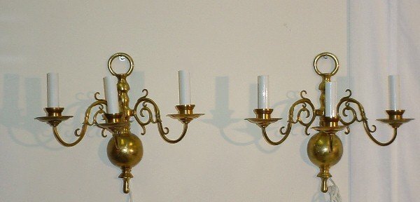Sold(PAIR) DUTCH STYLE BRASS THREE-LIGHT WALL SCONCES(pair) Dutch style brass wall sconces, baluster-shaped backplate, issuing three scrolling arms, ending in bobeche and faux candles, in need of wiring, approx 16"h, 16"w, 9.5"d; 10.5lbs total Start PriSee Sold Price