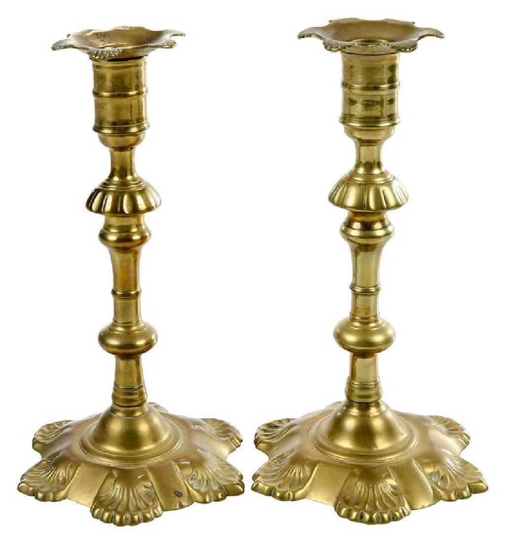 Pair George III Six Shell Brass Candlesticks