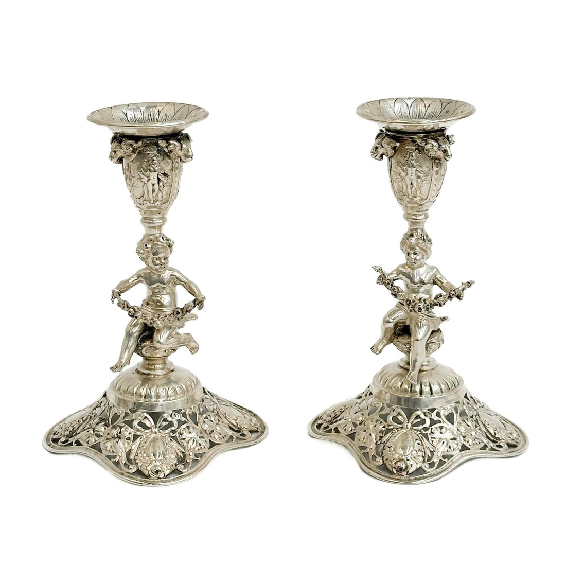 Pair German 800 Silver Figural Putti Candlestick Holders circa 1900