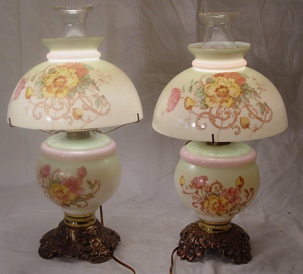 SoldPair of antique GWTW Gone With the Wind converted opaque glass oil lamps with floral decoration.Pair of antique GWTW Gone With the Wind converted opaque glass oil lamps with floral decoration. Short lamp is missing globe. 28 3/4"H x 7 1/2"Diam. (tallest)See Sold Price