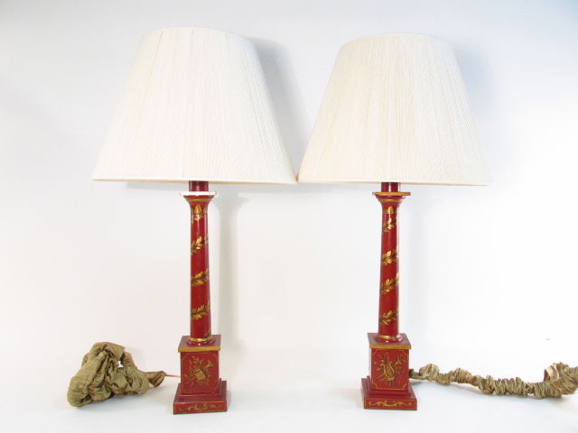 PAIR HAND PAINTED COLUMN STYLE TABLE LAMPS