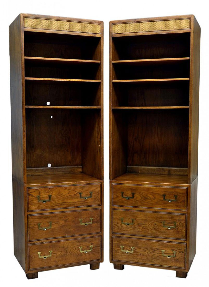 SoldModern, Bookcases, pairModern Bookcases, pair c. 1950mahogany 41 h × 30 w × 11.25 d in (104 × 76 × 29 cm) Each bookcase features three storage compartments and two drawers.See Sold Price