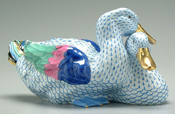 SoldA Large Pair of Rare Herend Porcelain DucksA Large Pair of Rare Herend Porcelain DucksHungary, a hard to find Herend porcelain sculpture of two ducks in blue fishnet design with gilt highlights. Marked Herend to the base.15 inches long, 10 incSee Sold Price