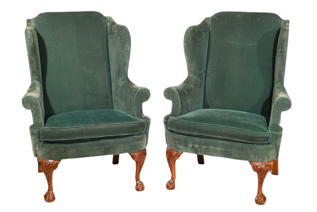 SoldCustom Upholstered Ball and Claw Wingback ChairsPair Custom Upholstered Ball and Claw Feet Wingback Chairs with Nail Head Trim. Needs to be re upholstered. Sold as is.Measures 41 inches x 33 inches x 35 inches seat height 18 inches.See Sold Price