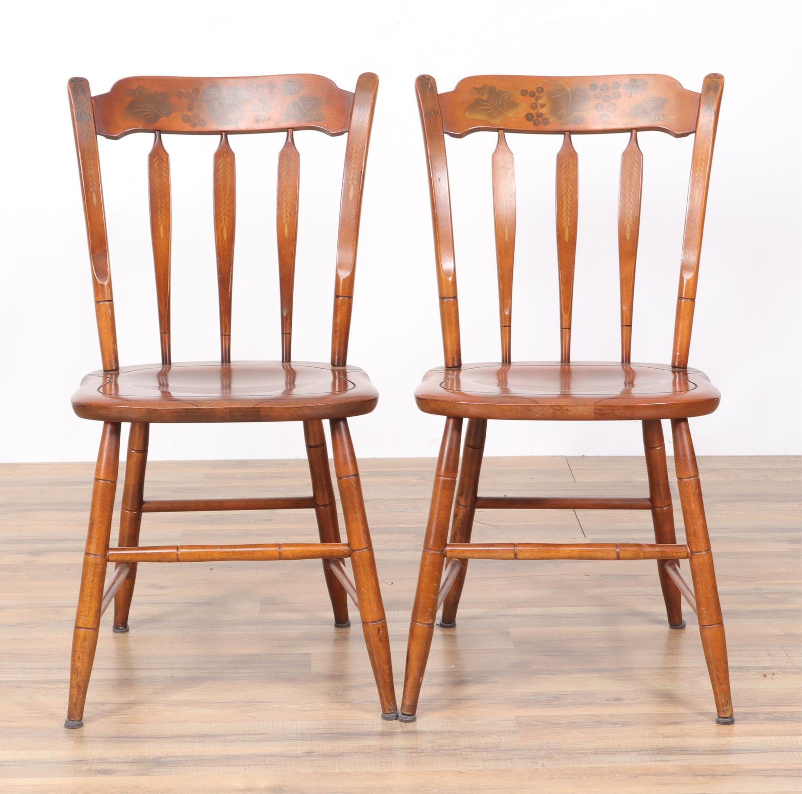 SoldPair Stenciled Hitchcock Style Side ChairsPair of Spindle backed stenciled Walnut and Ebony Side. Chairs, occasional chairs. Shaped seat with black backs and base. Turned splayed legs, turned Box stretchers. Stencil design of deer, leaves andSee Sold Price
