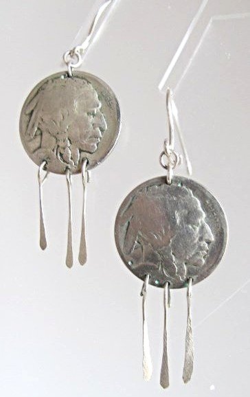 Pair Indian Head Pierced Earrings W/ Feather Drops