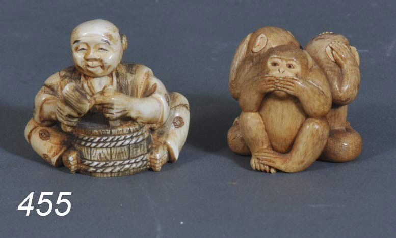 PAIR IVORY NETSUKES Monkey 1 1/4" high and Elder 1