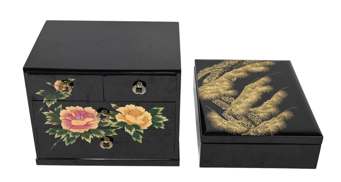 Pair Japanese Painted Black Lacquer Boxes