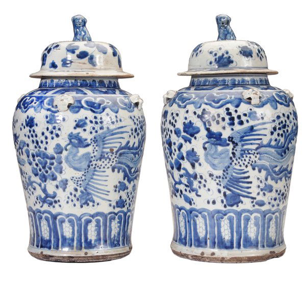 A lot of two Chinese blue and white Fu-lion and bird decorated porcelain vasesFeb 24, 2026A matching lot of two Chinese porcelain vases, finely decorated in blue and white with copper-red onFeb 24, 2026Pair of Chinese Blue and White Dragon-Motif Porcelain VasesFeb 26, 2026A Pair of Chinese Blue and White Jars4 days LeftPair Of Chinese Qing Dynasty Blue And White Porcelain"Double Happiness" Urns2 days LeftChinese Pair of Blue & White Prunus Covered Jars3 days LeftPr. Chinese Blue and White Porcelain Ginger JarsFeb 27, 2026(2) CHINESE BLUE & WHITE PORCELAIN COVERED GINGER JARS5 days LeftPr. Chinese Blue and White Porcelain Covered Ginger JarsFeb 27, 2026Pair Chinese Blue & White Porcelain "Double Happiness" Jars2 days LeftPorcelain Blue and White Giant Jar Vases, Set of 2A pair of hand-painted blue-and-white porcelain jars with gold-painted figures of generals, dating7 hrs LeftA PAIR OF BLUE AND WHITE PORCELAIN VASES AND COVERS IN KANGXI STYLE, CHINESEMar 03, 2026Pair of Chinese Blue and White Porcelain VasesFeb 27, 2026Pair of Vintage Asian Hand Painted Foo Dog Ginger JarsFeb 24, 2026A pair of blue and white porcelain vases depicting figures and stories from the Ming Dynasty,7 hrs Left
