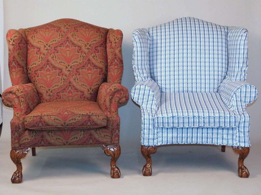 Pair Large Chippendale Style Wing Back Arm Chairs