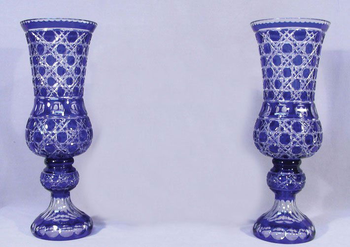 PAIR LARGE CUT CRYSTAL COBALT OVERLAY VASES