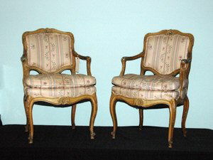 SoldPair Louis XV Style FauteuilsDown cushion. Slip seat. Approx. 34" H back, 17" H seat x 23 1/2" W x 18" D. From a 70-year collection from retiring antique dealer Harvey Sacks.See Sold Price