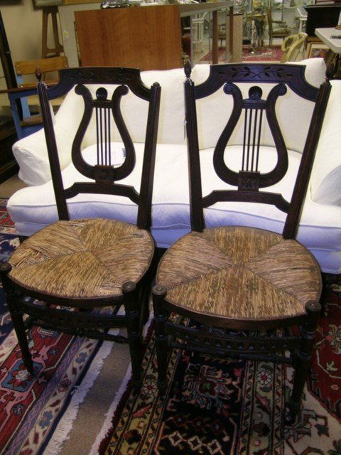 PAIR LYRE BACK ANTIQUE RUSH SEAT SIDE CHAIRS