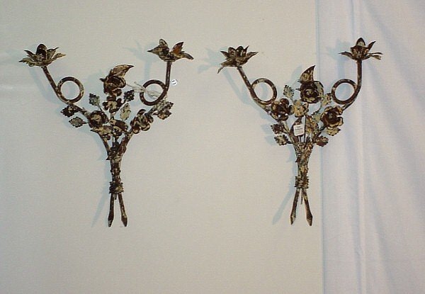 SoldA Pair of Painted Tole Palm-Form Two-Light Wall SconcesA Pair of Painted Tole Palm-Form Two-Light Wall Sconces 20th century Height 22 inches. Estimate $300-500 Property from H.R.H. Princess Maria Pia of Bourbon-Parma, Palm Beach, FLSee Sold Price