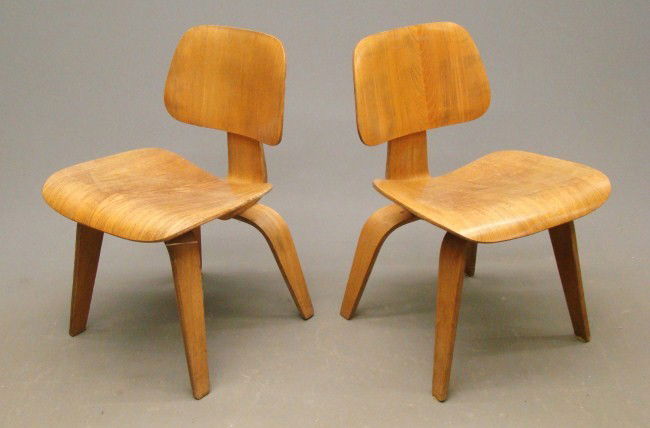 SoldPr Herman Miller Molded Plywood Eames ChairsA pair of fantastic mid century Herman Miller Eames molded plywood lounge chairs. One retains label to bottom. Chairs measure approx. 29" height x 19 1/2" width x 21 1/2" depth. Typical surface wear aSee Sold Price