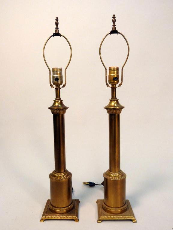 SoldPair of Neoclassical Style Brass Table Lamps20th century, urn and column form on wood base. 32 in. Collection of David and Carole Young, Greensboro, NC Additional high-resolution photos are available at LelandLittle.comSee Sold Price