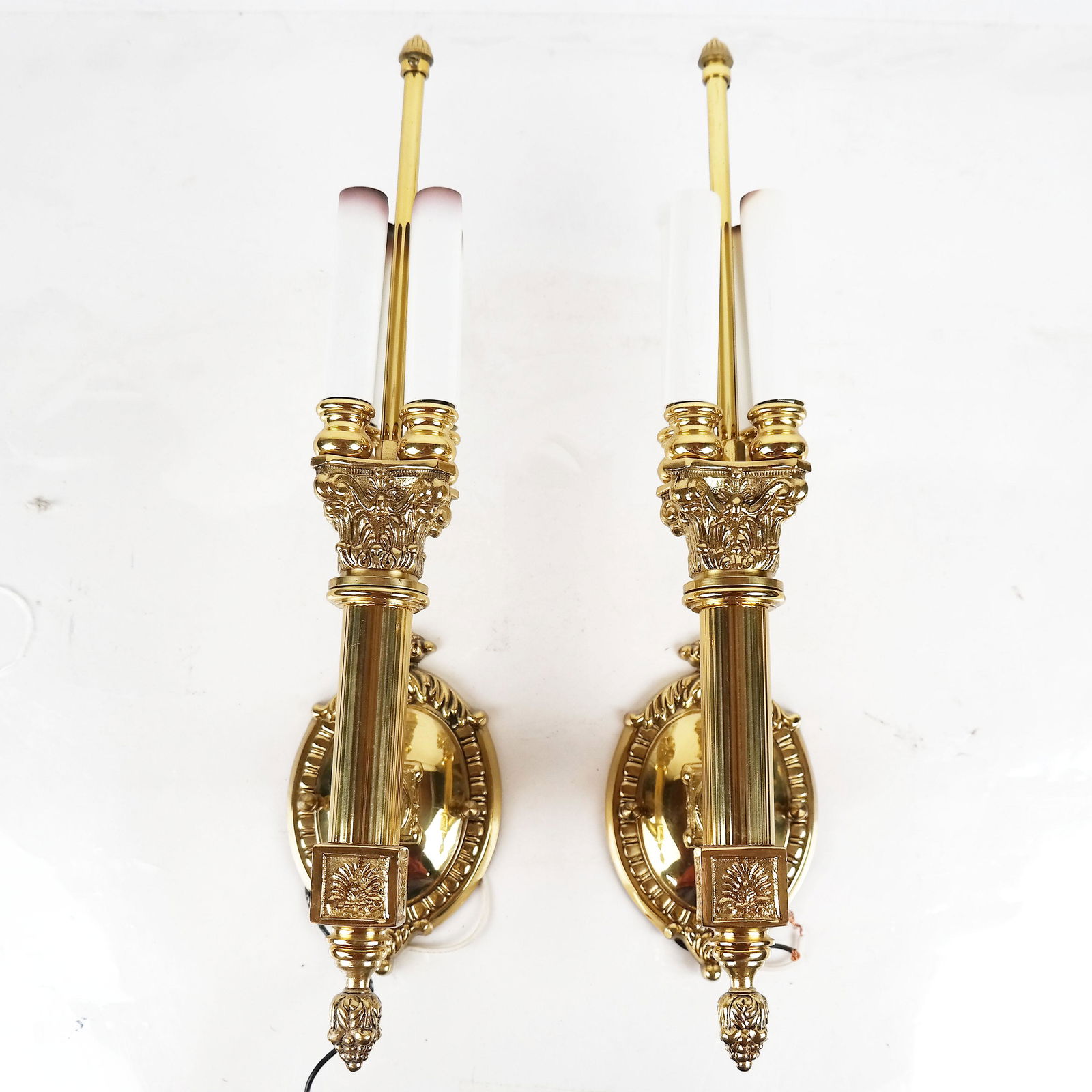 SoldPair Neo-Classical style gilt bronze sconcesPair Neo-Classical style gilt bronze sconces, 20th c., poss. Italian, nice quality, 2-light, unmarked, 13"h (total) x 8"wSee Sold Price