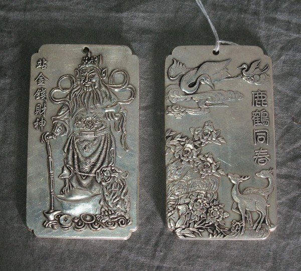 Pair of Chinese silvered scroll weights signed