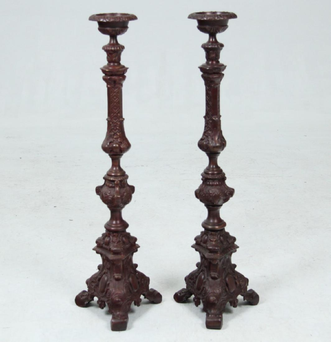 PAIR OF EMBOSSED BRONZE PRICKET CANDLESTICKS