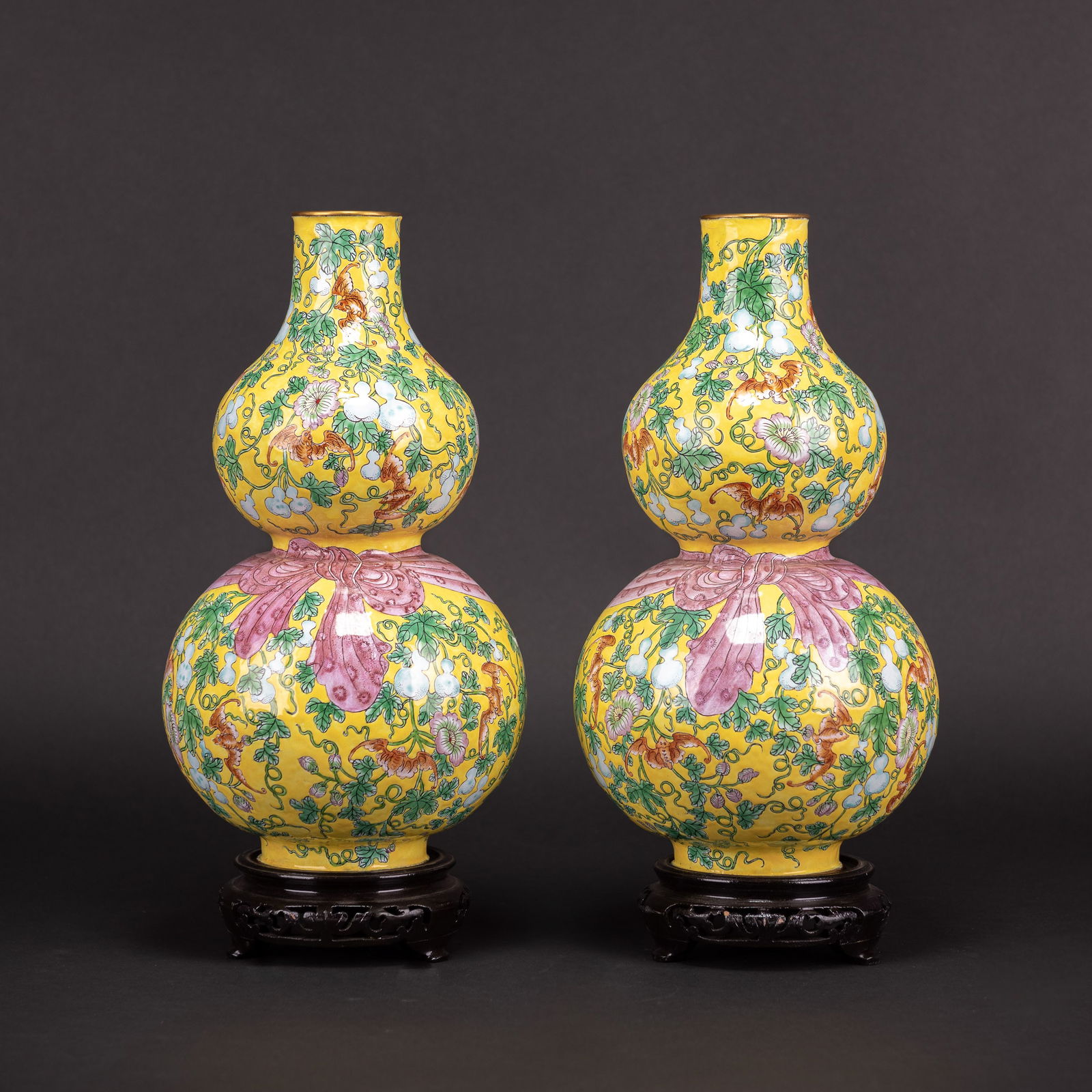 Pair of Enameled Double-Gourd Bronze Vases with Bases, Republic Period
