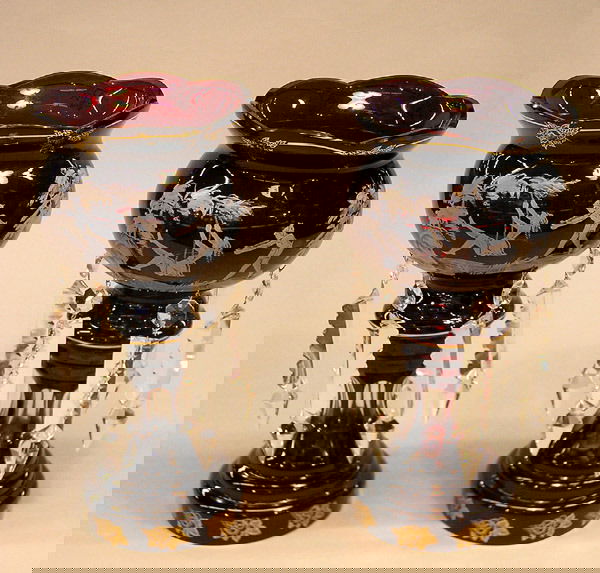 SoldPair of Victorian Enameled Ruby Glass Mantle Lusters.Pair of Victorian Enameled Ruby Glass Mantle Lusters. 14-1/4"h. Condition: Good.See Sold Price