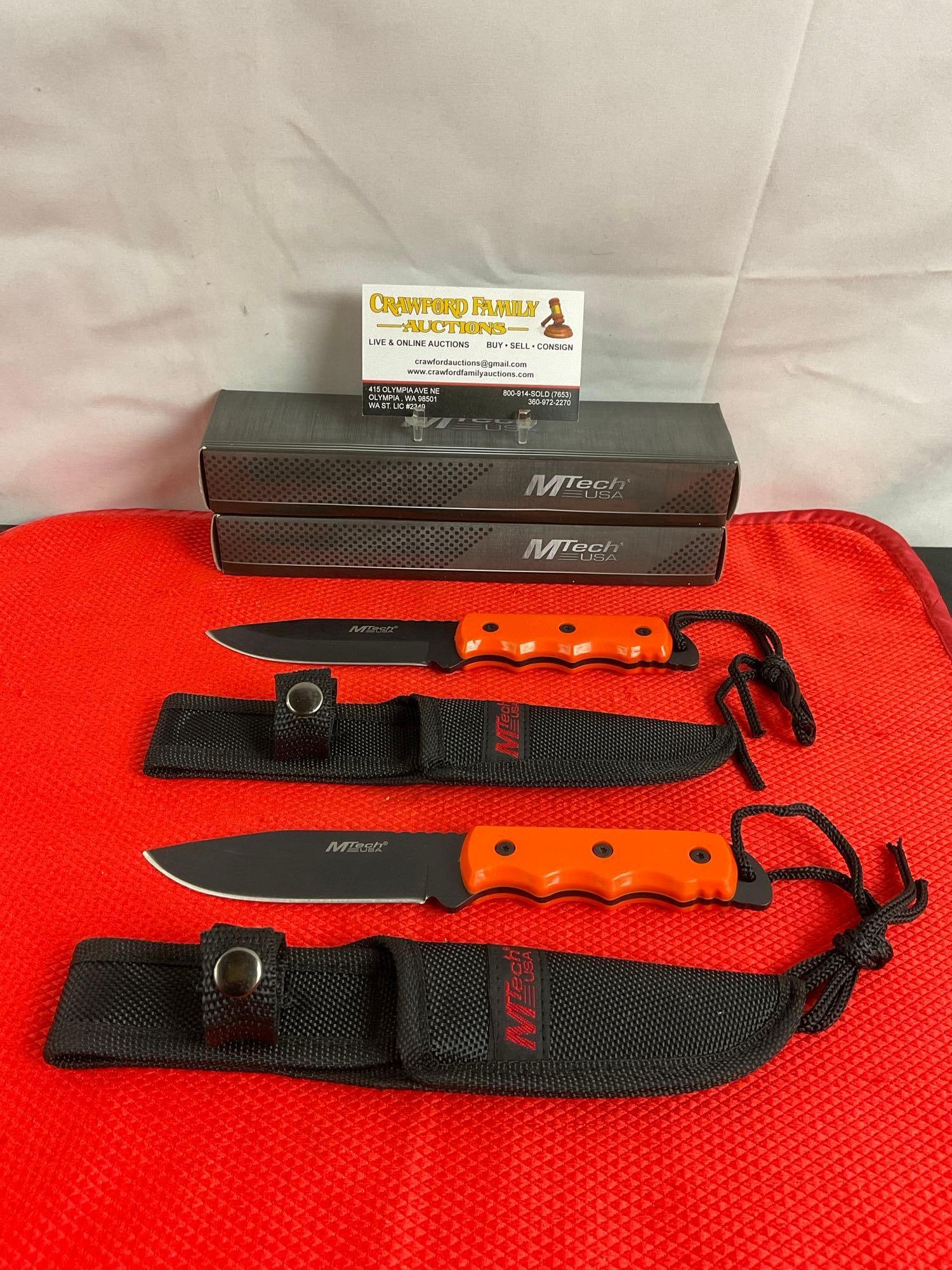 Pair of MTech USA 4" Steel Fixed Blade Hunting Knives Model MT-20-35 w/ Nylon Sheathes. NIB. See