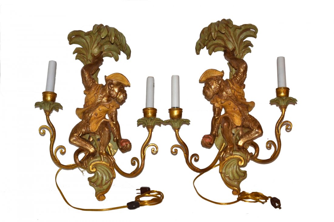 Pair of Hollywood Regency Palm Tree Monkey Wall Sconces with Gilt Accents7 days LeftTwo Pairs of Brass and Gilt SconcesApr 11, 2026Six Venetian Giltwood Monkey Sconces Mid-Century Italian Carved Lighting Set12 hrs LeftPAIR OF CHAPMAN ELEPHANT FORM SCONCES, CAST RESIN WITH GLASS GLOBES C. 1990Apr 16, 2026Vintage Pair of Solid Brass Wall-Mount Sconces.Colonial Williamsburg Solid Brass Candle Sconces Pair 20 Years Old3 days LeftA PAIR OF 20TH CENTURY BRONZE RECUMBENT LION FIGURESApr 15, 2026Pair Tole Wall SconcesApr 11, 2026Pair of Antique French Style Cherub Wall Sconces with Porcelain FlowersPair of Metal Gold Colored Wall Sconces Wrought Iron Style and Leaf Design Candle HoldersApr 22, 2026Maison Arlus, a pair of wall sconces,Apr 21, 2026Pair of Iron Candle SconcesApr 11, 2026Pair Classical Wall SconcesApr 11, 2026Pair of Vintage 1925 Venetian Eglomise Mirrors with Polychromed Sconces4 days LeftA PAIR OF IRON MONKEY ORNAMENTSApr 09, 2026Pair Brass Wall SconcesApr 11, 2026