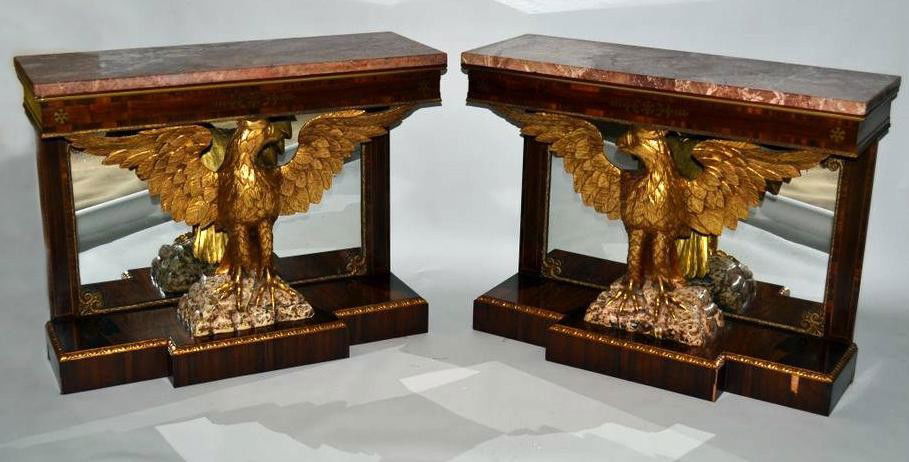 Y A PAIR OF REGENCY MAHOGANY AND KINGWOOD TEA TABLES, CIRCA 1815Feb 18, 2026(2) NEOCLASSICAL STYLE SPECIMEN MARBLE-TOP RAM'S HEAD CONSOLE TABLESFeb 22, 2026American Neoclassical Hand-Carved Eagle Console TableLarge Gilded Eagle Marble-Top Console or PedestalParcel Paint and Gilt Decorated Pair of Swedish Serving or Console Tables(2) GEORGIAN STYLE MARBLE-TOP & PARCEL-GILT EAGLE MOTIF CONSOLE TABLESFeb 22, 2026Pair of Empire Style Egyptian Revival Mahogany Marble Top Pier TablesFeb 24, 2026Y A PAIR OF REGENCY BRASS INLAID ROSEWOOD AND PARCEL GILT SIDE CABINETS, CIRCA 1815Feb 18, 2026Neo-Classical Console Table with Eagles and Marble Top5 days LeftPAIR OF ENGLISH CAMPAIGN STYLE END TABLES3 days Left(2) VENETIAN PARCEL-GILT & MARBLEIZED PAINT-DECORATED CONSOLE TABLESFeb 22, 2026Pair Louis XV Style Marble Top Giltwood Wall ConsolesFeb 27, 2026Pair of 19th Century Empire Style Mahogany, Ormolu and Marble Corner Cabinets7 days LeftA PAIR OF REGENCY FIGURED MAHOGANY TEA TABLES, IN THE MANNER OF WILLIAM TROTTER, CIRCA 1820Feb 18, 2026Pair of Neoclassical Style Marble-Top Console D'Appliques4 days LeftImportant Empire console from the late 18th century, early 19th century, circa 18005 days Left