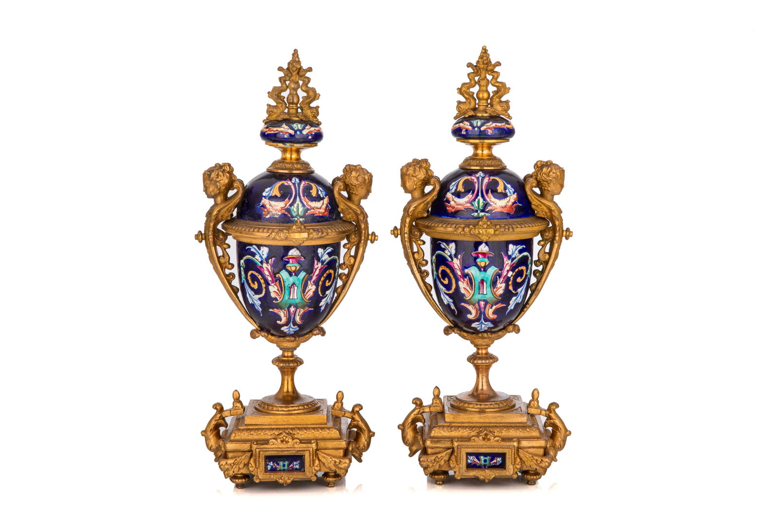 PAIR OF SEVRES-STYLE GILT BRONZE MOUNTED URNS
