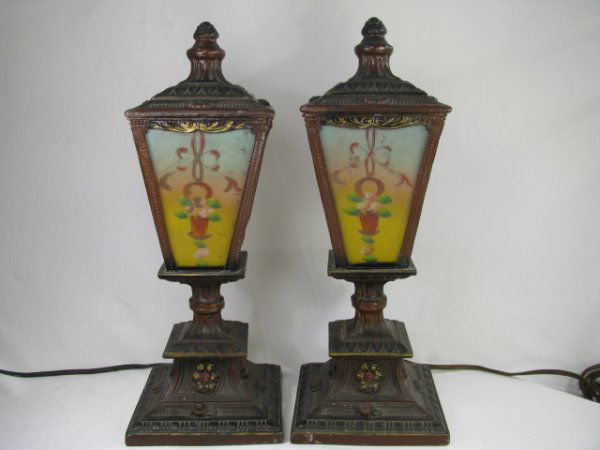PAIR PAINTED METAL REVERSE PAINTED PANELS LAMPS