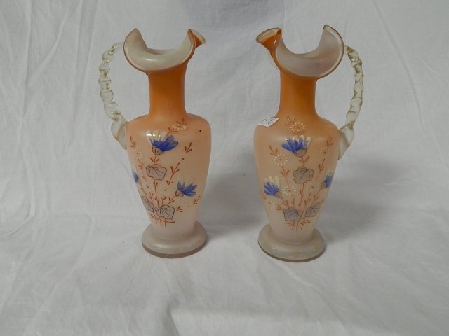 PAIR PEACH VICTORIAN ENAMEL EWERS