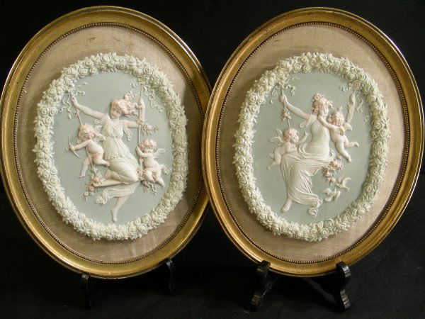 PAIR POLYCHROME BISQUE PLAQUES GILT FRAMED