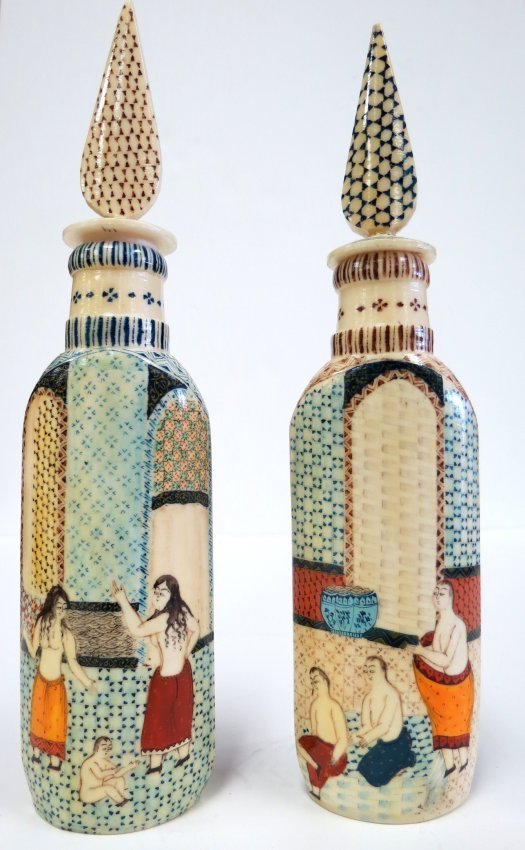Pair Polychrome Perfume Bottles Turkey H: 6.5"
