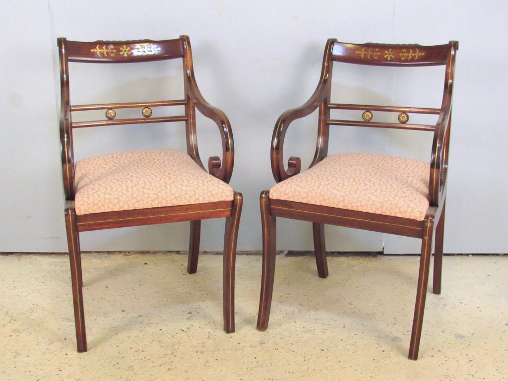 SoldPair of Regency-Style Arm Chairs, Late 20th c.Pair of late 20th century Regency-style arm chairs. [44" H x 26" W x 24" D; 19 1/2" to seat]. In good condition.See Sold Price