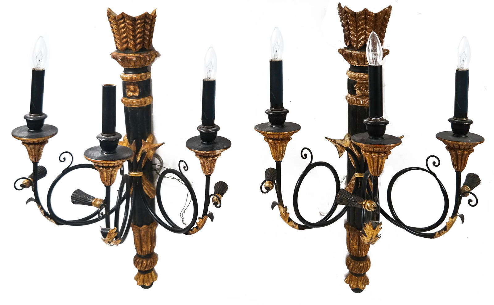 SoldPAIR OF REGENCY STYLE GILT BRONZE 3 LIGHT WALL SCONCESPAIR OF REGENCY STYLE GILT BRONZE 3 LIGHT WALL SCONCES, FRANCE, LATE 18TH/EARLY 19TH C.; 16"H X 13"W; CONDITION: WEAR TO GILDINGSee Sold Price